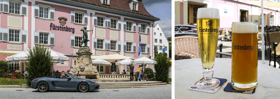 Was uns zur zweiten Sehenswürdigkeit von Donaueschingen bringt. Denn von der altehrwürdigen Brauerei mit dem heimeligen Biergarten davor sind es nur ein paar Schritte zur berühmten Donauquelle im pittoresk angelegten Fürstlich Fürstenbergischen Schlossgarten. Die schön eingefasste Donauquelle darf als Symbol gelten, mündet sie doch bald in die Brigach, die gemeinsam mit der Breg als Quellfluss der Donau gilt. Ganz so, wie es unzählige Kinder als Eselsbrücke im Erdkunde-Unterricht gelernt haben: „Brigach und Breg bringen die Donau zuweg.“ Auch wir wollen heute noch etwas zuwege bringen und lenken den 718 Boxster S ostwärts, unterqueren die A81 und fahren weiter Richtung Tuttlingen. (...)